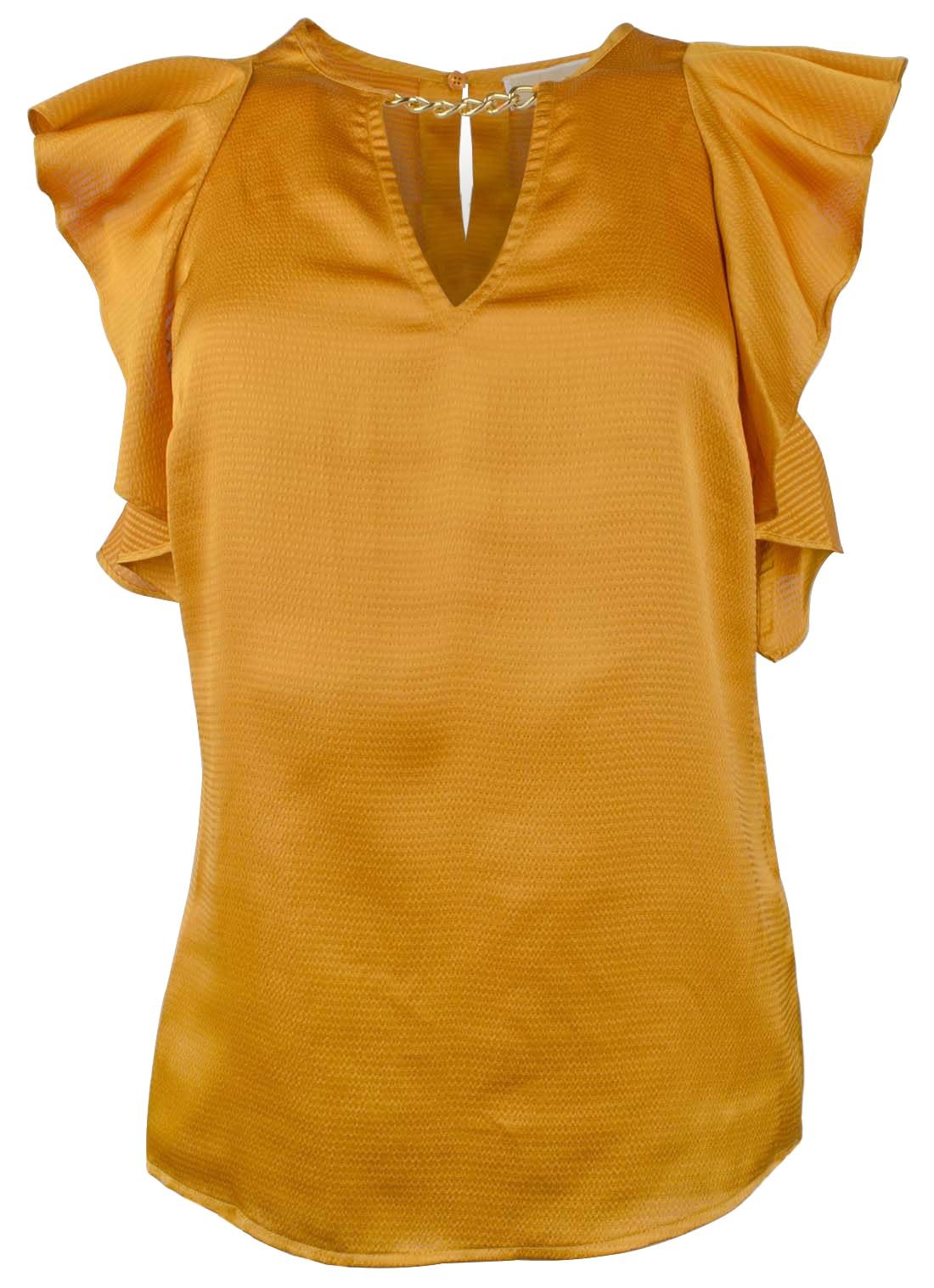 For a classy and elegant look, try on the MICHAEL Michael Kors Hammered Satin Paisley Top with chain detailing on the neck. Pullover style. Bold V-neckline with chain design and short ruffled sleeves. Straight hemline. 60% recycled polyester, 40% polyester. Machine wash, tumble dry. Imported.For a classy and elegant look, try on the MICHAEL Michael Kors Hammered Satin Paisley Top with chain detailing on the neck.Pullover style.Bold V-neckline with chain design and short ruffled sleeves.Straight hemline.60% recycled polyester, 40% polyester.