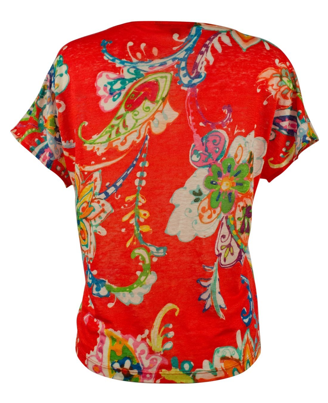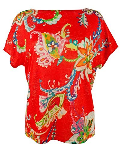 Women's petite 100% Linen floral lightweight chic top. Relaxed-fit. Bateau neckline. Dolman short sleeves.