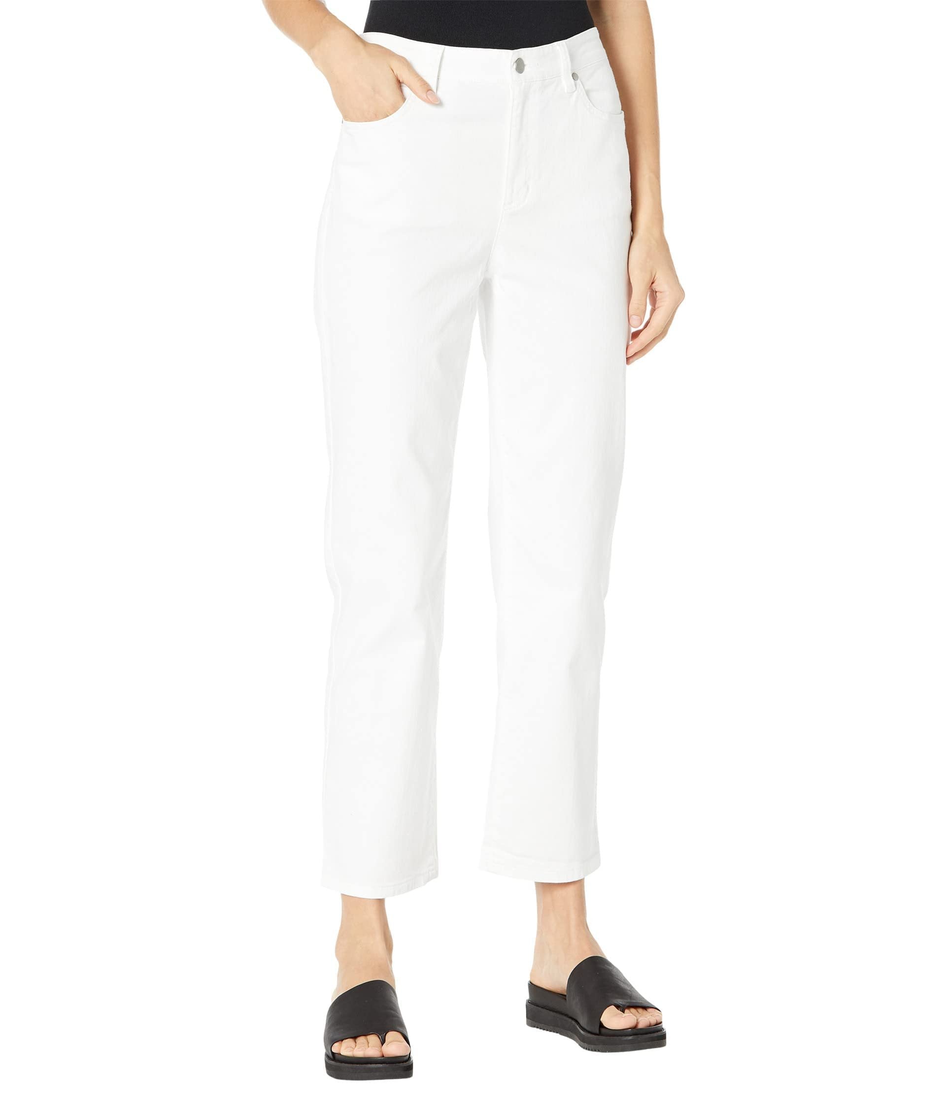 Eileen Fisher pants in organic cotton stretch denim garmentdyed for a saturated color Approx. 29" inseam High rise waist Flat front Fivepocket style, straight legs Button/zip fly/ belt loops Organic cotton/spandex Machine wash cold Imported.98% Organic Cotton, 2% SpandexHigh Waist Straight Leg Stretch Ankle Denim, Zip fly, Belt loopsMachine wash cold Imported