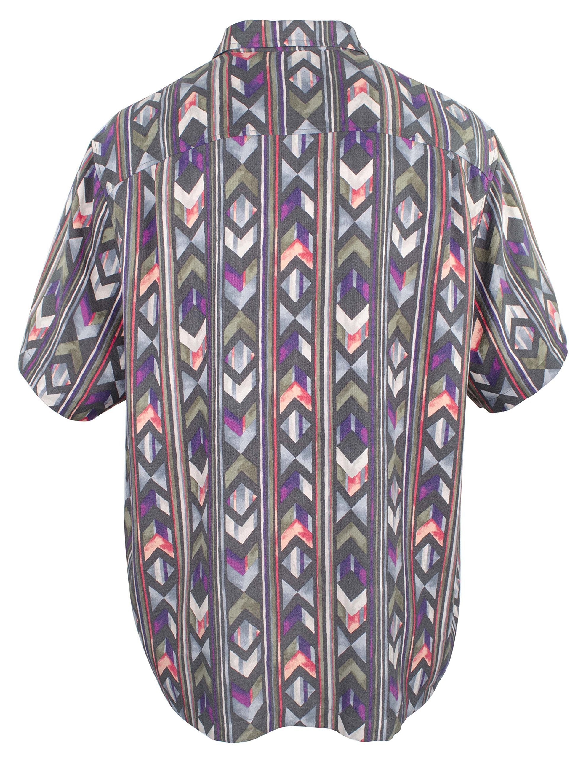 75% Silk, 25% polyester. Chest pocket. Back yoke with shoulder pleats. Straight hem with side vents. A bold and striking arrow print.