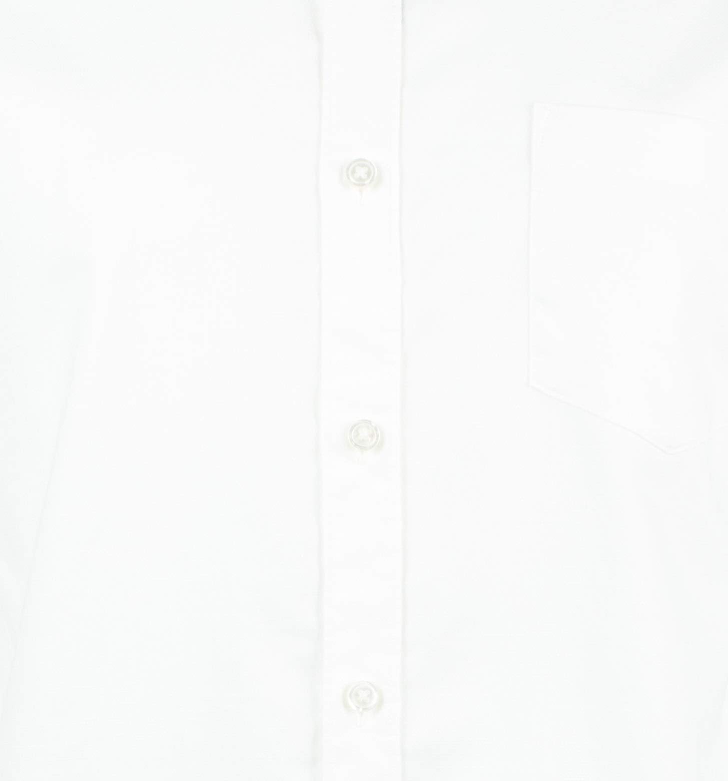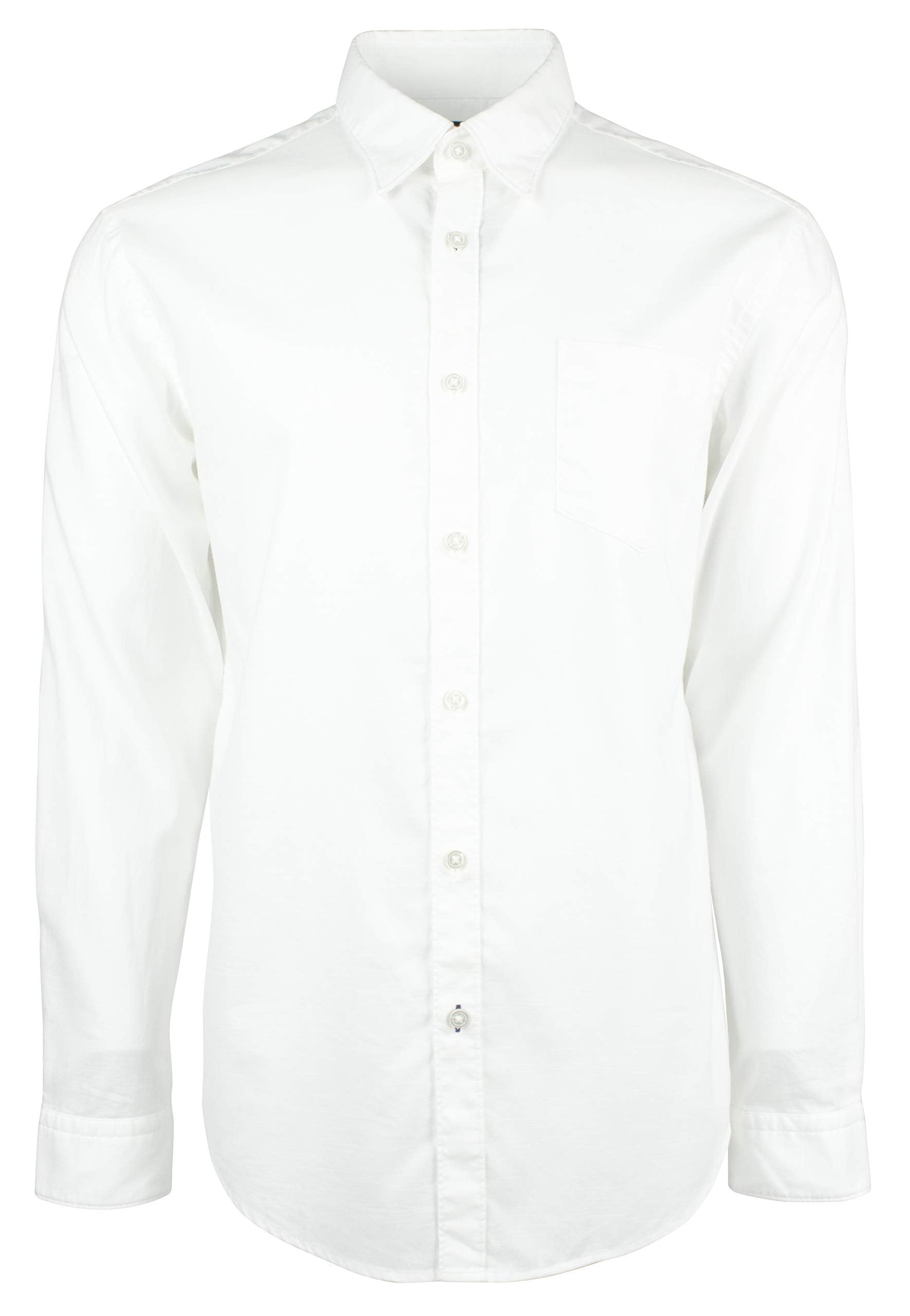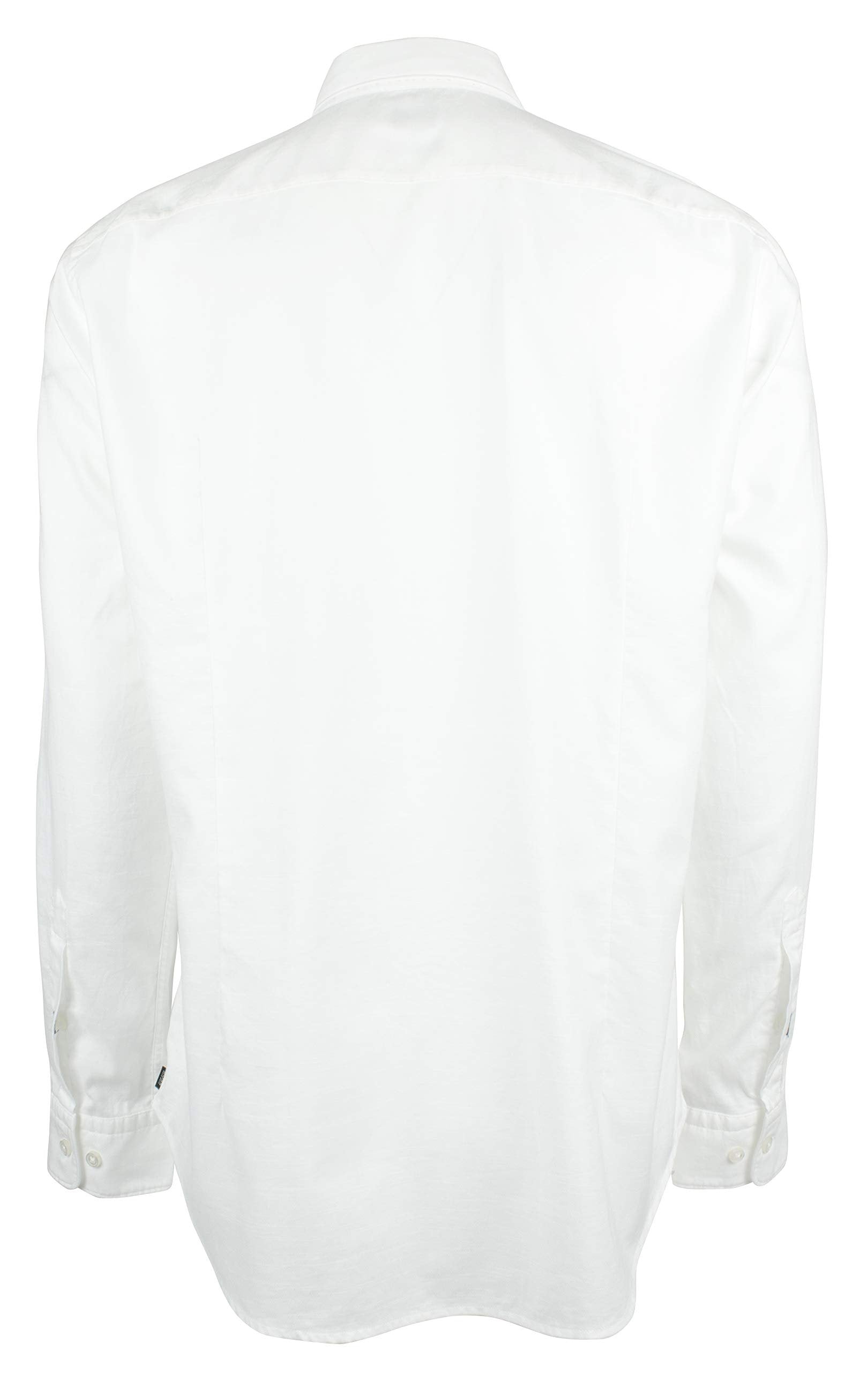 90% cotton, 10% linen. Piping at the inner collar and subtle contrast yarn details at the cuffs. Cut to a narrow silhouette/slim fit. Single barrel rounded cuffs. Curved hem. Hang dry. Machine wash cold.