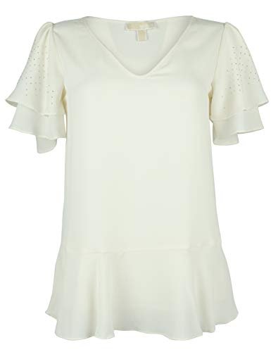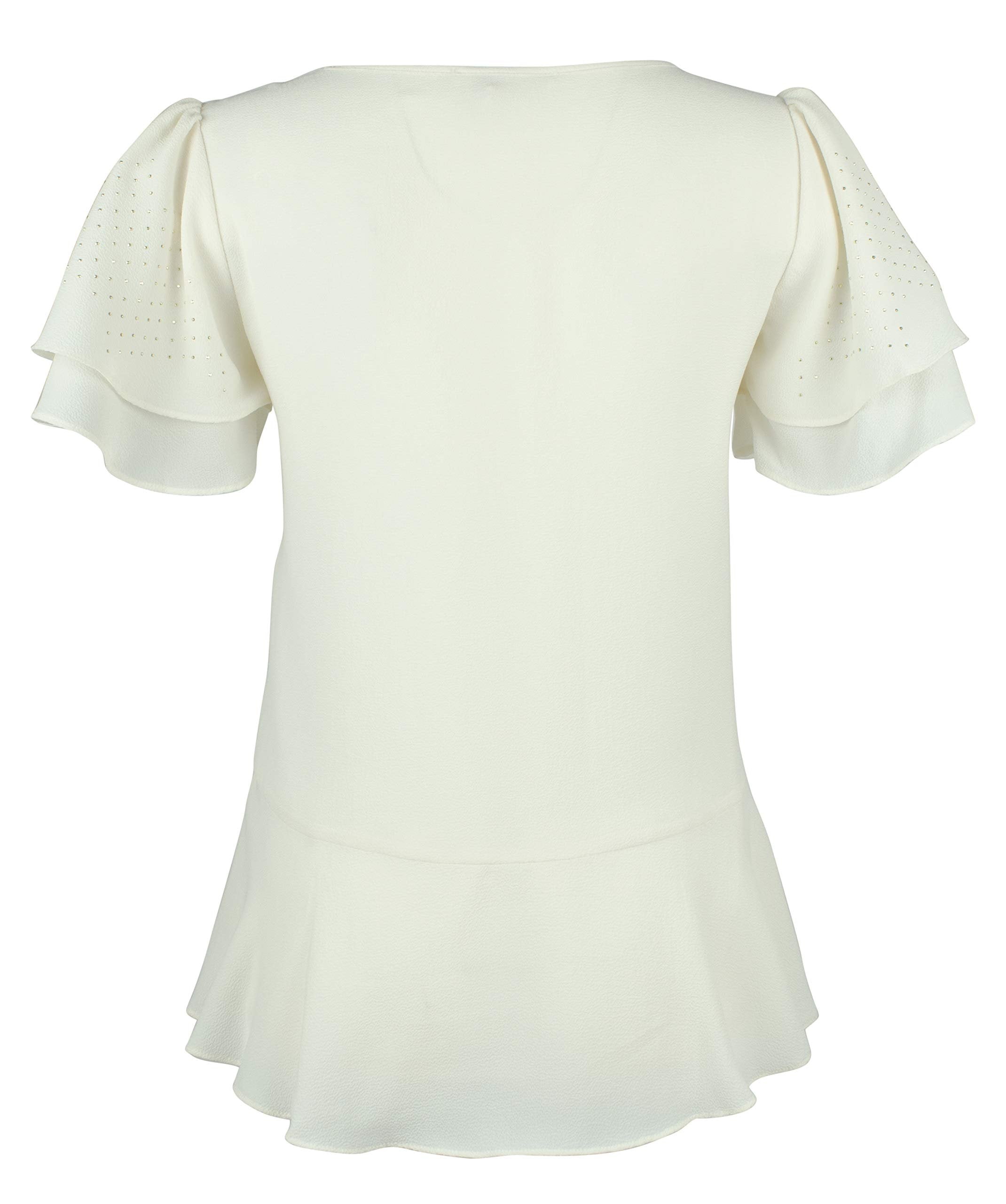 98% polyester, 2% elastane. V neckline. Fluid silhouette. Short, double ruffled sleeves, featuring metallic micro dots. Peplum hem. Pullover. Machine washable; Imported.98% Polyester, 2% ElastaneV neckline. Fluid silhouetteShort, double ruffled sleeves, featuring metallic micro dotsPeplum hem. PulloverMachine washable; Imported
