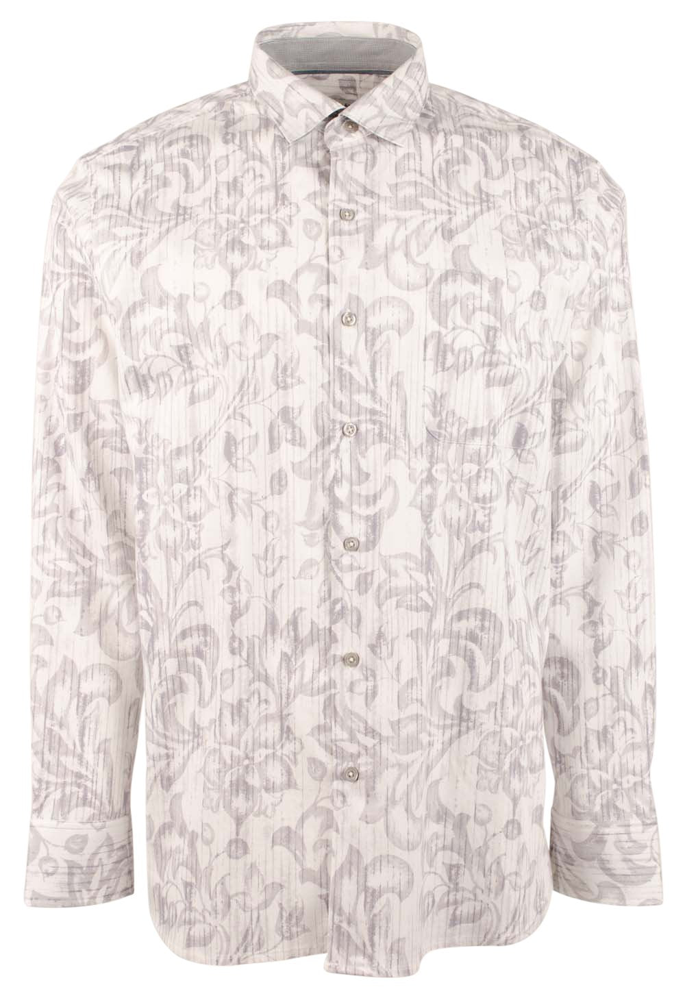 71% cotton, 26% silk, 3% spandex. Regular fit. Stretch fabric. Spread collar. Button closure. Print of flowering branches tonal and stripes. Left chest rounded pocket. Long sleeves with contrast color cuffs. Side seam gusset. Machine wash cold or dry clean. Imported.71% cotton, 26% silk, 3% spandexRegular fit. Stretch fabric. Spread collar. Button closure