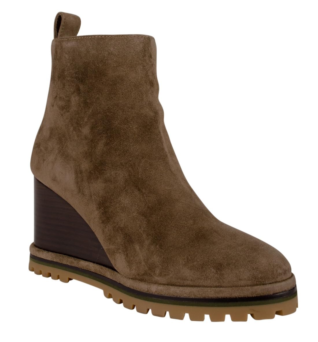 Natural Suede upper. Tory Burch double-T logo. Side zip closure. Leather lining and insole.Cushioned footbed. Approx. 3 1/4" heel, 4 1/2" shaft. Stacked wedge and lugged sole. Imported.Natural Suede upperSide zip closure. Leather lining and insoleTory Burch double-T logo. Cushioned footbedApprox. 3 1/4" heel, 4 1/2" shaft. Stacked wedge and lugged soleImported